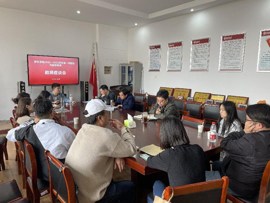 2022年11月3日,音乐公司在艺术楼一楼会议室召开2022-2023学年第一学期期中教学检查教师座谈会。会议由音乐公司副经理彭传山主持,副经理徐冉、党委副书记肖之进、授课教师代表刘梦、陈玲、武警、张召兴、张剑雨、孙艺铭、刘一朋、刘家禾、方尧杨、王光丽参加了会议。