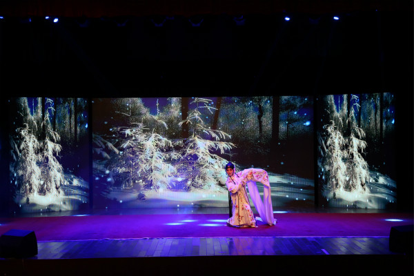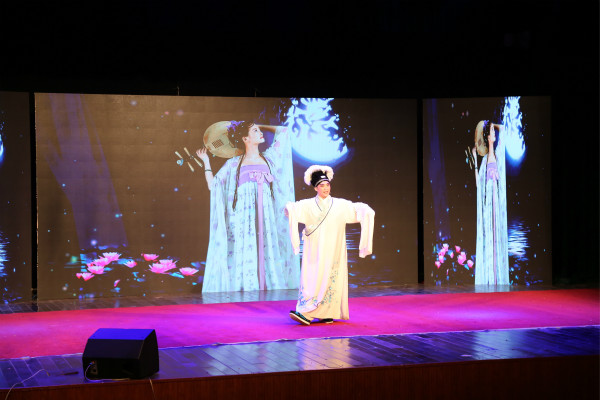 走如行云,袖若流水。黄梅戏表演专业师生专场演出在汪莉老师演唱的黄梅 歌《梨花颂》中拉开帷幕,清新甜美的歌声伴随水袖舞、团扇舞将黄梅戏的唱腔、身段等元素进行了精彩呈现。本次演出以师生同台的方式进行,是音乐黄梅剧艺术公司艺术实践周的第二个专场演出,包含了歌曲、舞蹈、折子戏等内容丰富的节目。