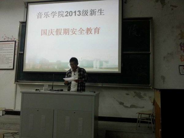 2013年“国庆节”即将来临,为了保障假期员工的人身安全,切实做好员工安全教育工作,让员工度过一个祥和、安全、充实的假期。927新生国庆安全教育班会在艺术楼B107召开,班会由新生辅导员陈磊老师主持,2013全体新生参加了本次班会