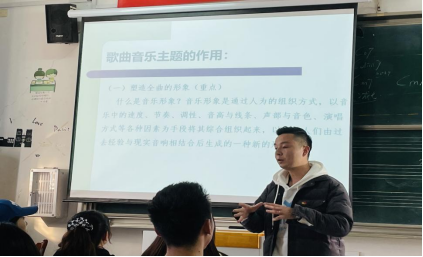 陈星源老师以“歌曲主题的创作”为教学主题,围绕“课程思政”展开教学活动。教学设计结构合理,教学知识内容充实,曲例素材多元,特别是将其本人的原创歌曲作为教学素材,使员工对课堂充满兴趣,认真思考,积极回答问题,课堂整体氛围良好。