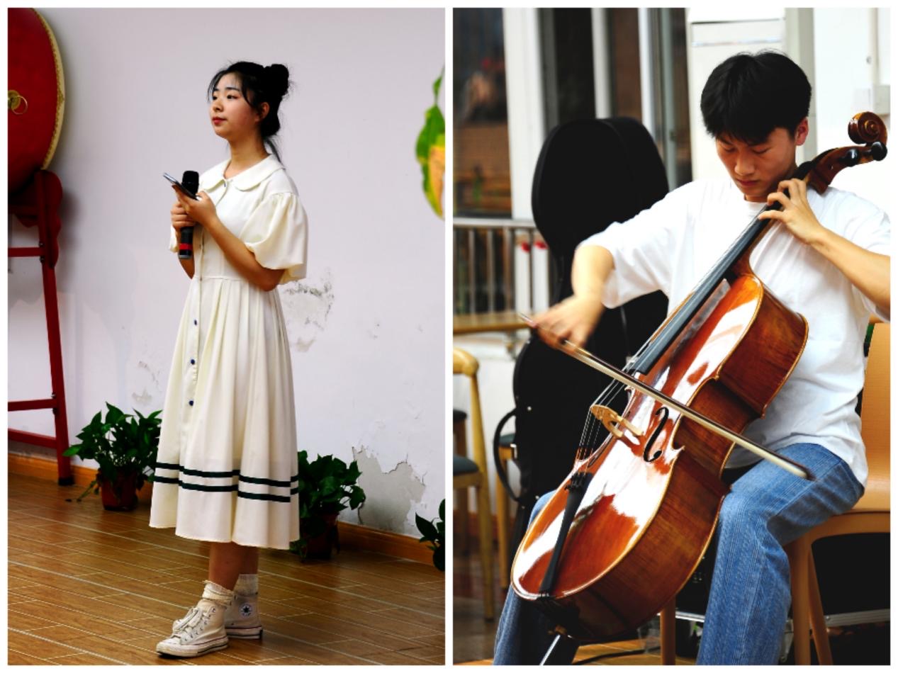 歌曲《歌唱祖国》将现场气氛推向高潮,表演者用大提琴做歌曲伴奏,浑厚丰满的乐器声响起后让现场不少观众直呼“耳目一新”。“因为排练时间较短,我们在排练中也遇到了一些困难,刚开始我们并不能将乐器和人声很好的融和在一起,后来大家就一起想办法,尝试利用和声来降低大提琴声部,衬托高音声部。”音乐学专业2020级(3)班的王仕鑫表示为了达到最好的演唱效果他和成员们每天都去琴房排练和磨合,最终顺利地完成了声部的磨合,顺利完成活动。