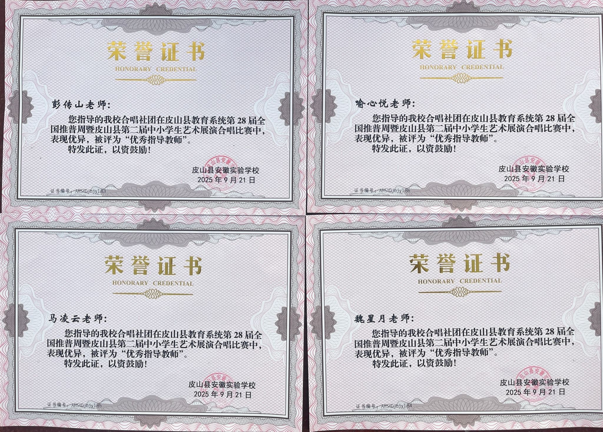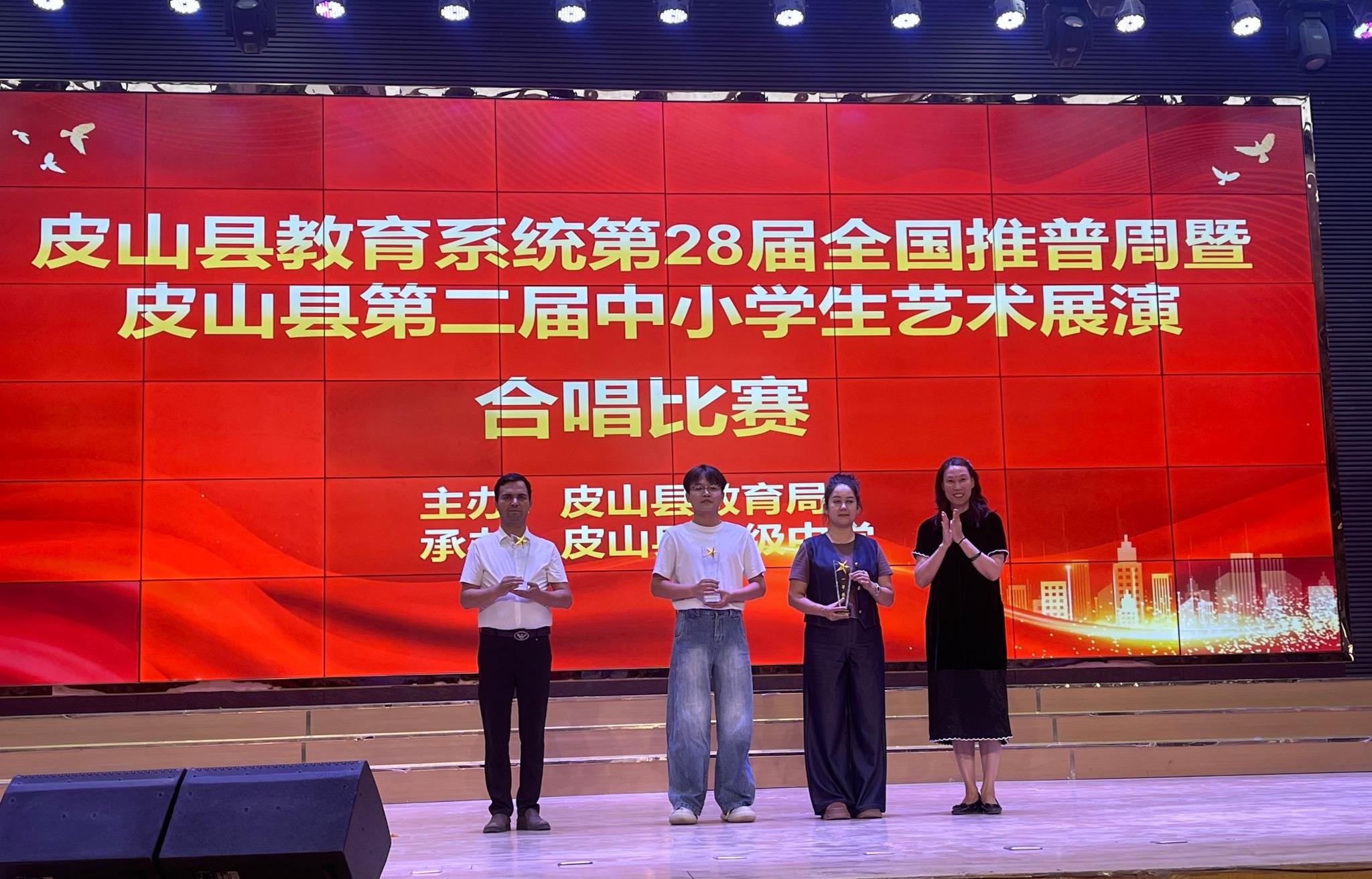 皮山县教育系统“第28届全国推普周暨皮山县第二届中小员工艺术展演合唱比赛”决赛于9月18日在皮山县高级中学体育馆举行。由魏星月、喻心悦、马凌云等同学排练,喻心悦指挥、彭传山伴奏的安徽实验公司合唱团演唱的《天耀中华》荣获初中组一等奖第一名。由李婧艳参与排练并指挥的第二中学合唱团演唱的《松花江上》与《保卫黄河》,荣获高中组二等奖。