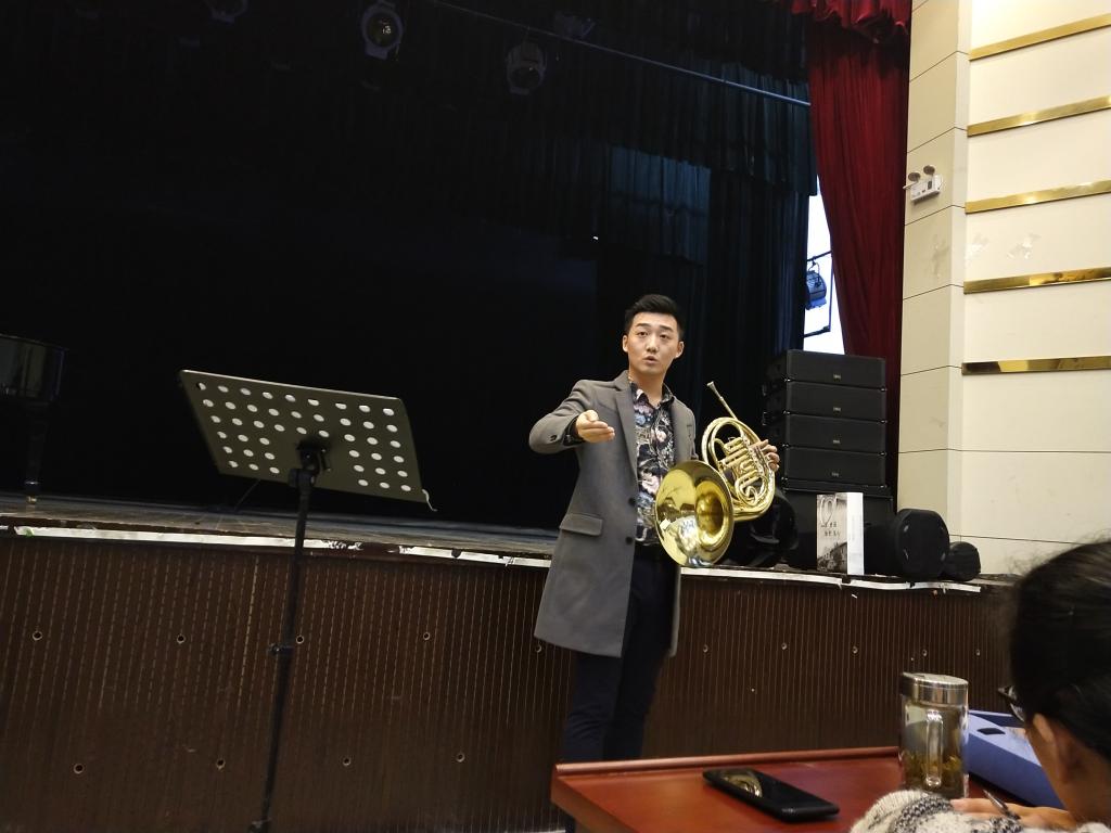 现场,张昱靖老师分别拿小号、圆号和长号进行示范,从手势动作、吸气呼气等方面对同学们进行指导。张老师的授课方式幽默风趣,与同学们积极互动。“怎么吹呢?不是往上吹,也不是往下吹,而是均匀地往外吹。”讲解的同时,张老师便拿起长号现场演奏起来,赢得在场同学和听课老师的阵阵掌声。