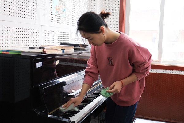 用稍润湿的毛巾擦拭乐器灰尘,再用干布擦干水渍……舞蹈表演专业2020级的周昕沛反复擦拭着钢琴,确保每一处缝隙都“照顾”到位。“对于经常需要练琴的同学而言,琴房就像第二个‘家’,希望大家能在更好的状态中提升专业技能。”一位练琴的员工在看到志愿者们的付出劳动后,向他们表达了内心的感谢:“谢谢你们为我提供了舒适整洁的学习环境,感觉练琴都更加有动力了!”