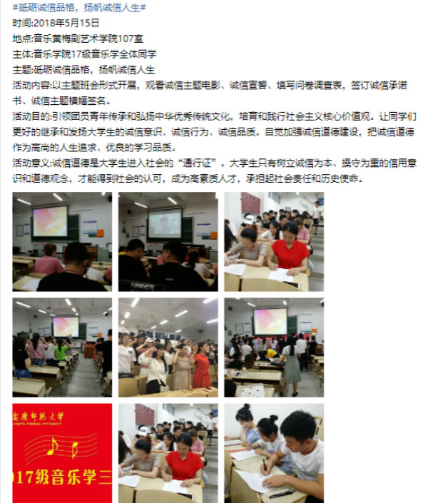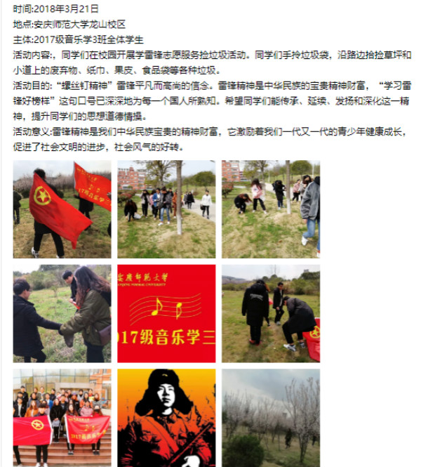 团支部思想引领作用强,政治功能好。支部在多个方面发挥着优秀的模范引领作用,荣获安庆市“五四红旗团支部”、校“红旗团支部”等十余项集体荣誉。新冠肺炎疫情期间,支部发起或参与抗疫音乐作品《没有如果》、《待楚乡绽放》、《我们》的创作、录制或演唱,作品被学习强国、中国青年网、新华社等多家媒体报道,彰显先进性,韶华勇担当。