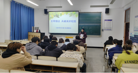 本次班会由班长邸依涵主持,她分别从班级学习生活、班级形象、课堂方面、考勤、寝室卫生及班级思想等方面进行文明倡议。辅导员肖之进表示通过3个月的学习生活,看到同学们的成长,希望同学们以先进班集体为榜样,以十佳班集体为目标,每一位同学都不掉队,共同建设美好校园。熊星子对下学习生活规划进行了指导,她表示希望同学们合理分配时间,安排好个人的学习与生活。
