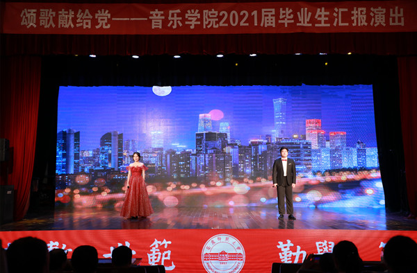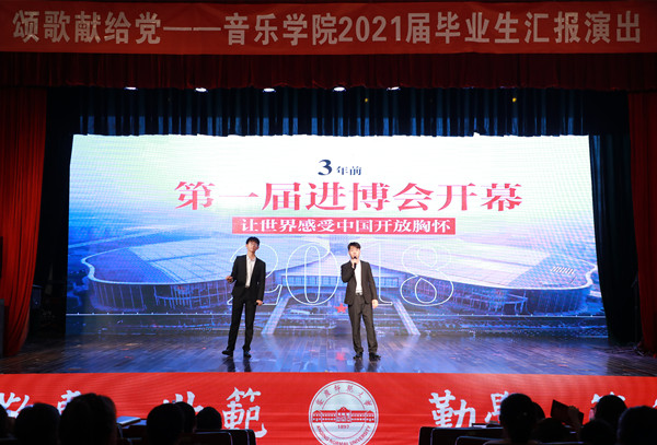 “我宣誓!我宣誓!我志愿加入中国共产党……”晚会以入党誓词歌《我宣誓》拉开序幕, 2021届音乐学专业毕业班全体党员共同演唱。毕业生党员们胸前佩戴党员徽章,身姿挺拔,用浑厚洪亮的歌声动情地传达对党的一片赤诚之心,赢得现场阵阵掌声。